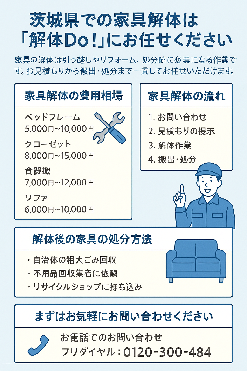 「解体Do!」では、茨城県内での家具解体に豊富な実績があります。無料での現地調査や見積もりのご依頼を承っておりますので、お気軽にお問い合わせください。